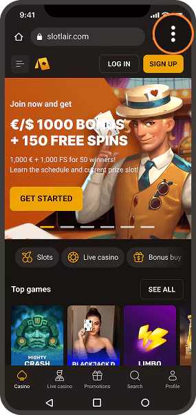 Go to the SlotLair homepage and tap three dots to open the browser menu.